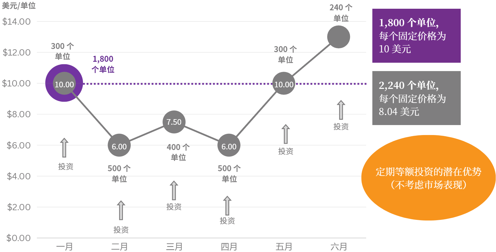 通过长期持续投入,您不仅能更轻松地管理付款,还能享受到美元成本平均带来的益处。借助这种策略,可在价格较低时买入更多份额,在价格较高时买入更少份额,从而有助于降低市场波动的影响。